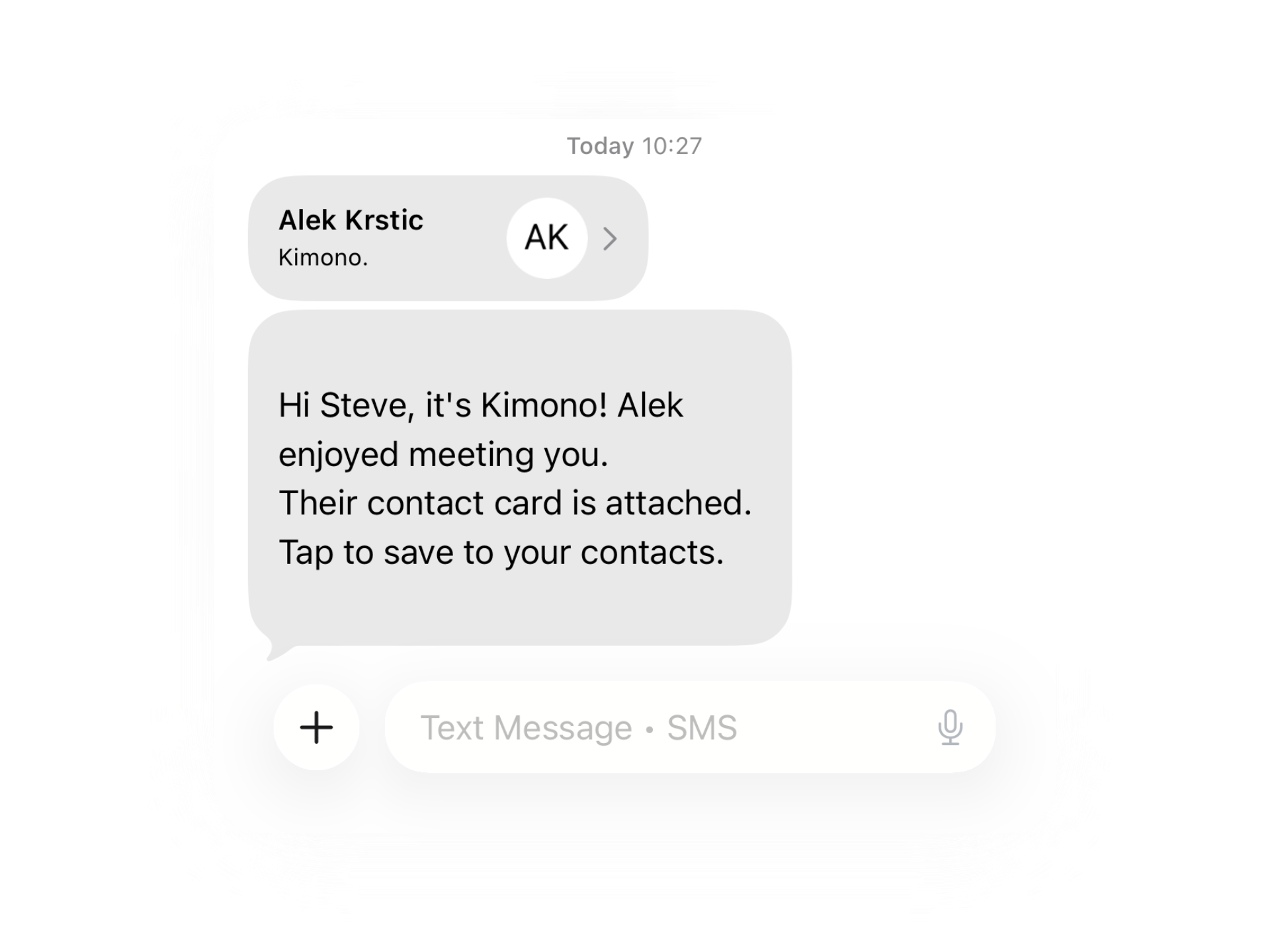 Pick what you want to share — your name, role, links, and preferred channels.Kimono builds a personal smart contact in seconds.